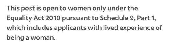 To ensure this horror doesn’t happen, Schedule 9, Part 1 of the Equality Act 2010 helps out such organisations applying for staff with an occupational requirement exception, which permits such jobs to be applicable for women only. Otherwise, job applications for sensitive roles like this would be open to men too who could sue for discrimination if prohibited from applying or taking up these roles. Schedule 9 Part 1 is explicit in stating that there is no ‘get around’ this exception by virtue of being transgender.